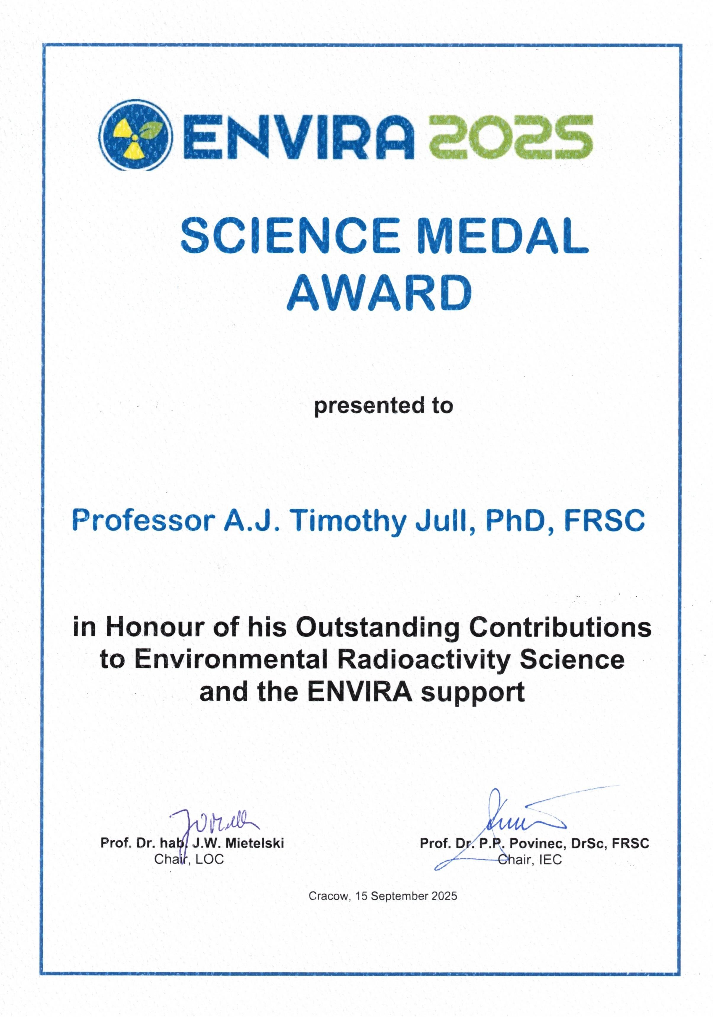 A HUN-REN Atommagkutató Intézet (ATOMKI) tanácsadója, A. J. Timothy Jull professzor munkáját tudományos éremmel (Science Medal Award) ismerték el a környezeti radioaktivitással foglalkozó ENVIRA (International Conference on Environmental Radioactivity) konferencián. A nemzetközi eseményt 2025 szeptemberében a lengyelországi Krakkó városában rendezték meg, fókuszában ezúttal a klímaváltozás tanulmányozásában fontos szerepet játszó radioaktív izotópok álltak.